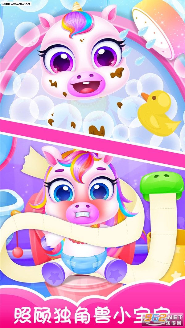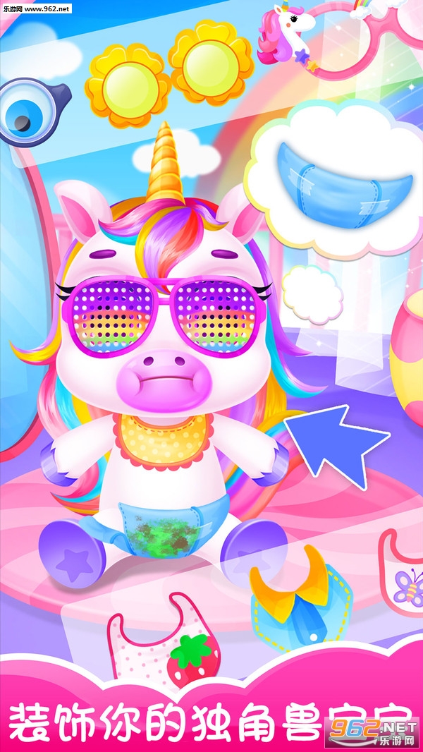 哇,你有一匹可爱的彩虹小马。所以我们需要照顾她。独角兽宝宝小马需要打扮、吃东西、洗澡、玩耍等许多活动。向你的小独角兽小马表达你的爱。