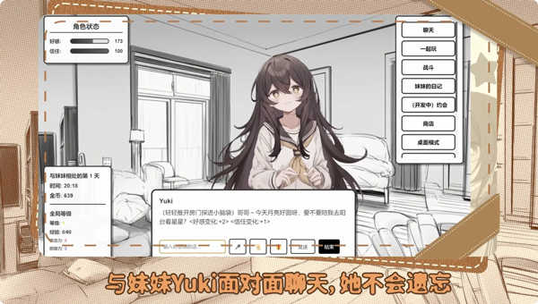 4、妹妹Yuki来了,我们可以与她进行对话聊天,了解她,对话可以自己输入,也可以选择游戏给你的选项。