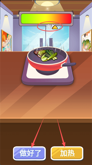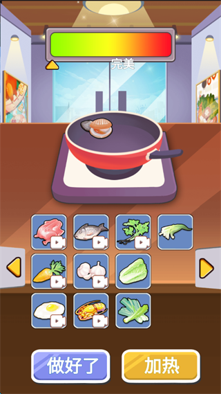 2、长按屏幕右下角的加热,随即注意屏幕上方的完美”二字,最好将指针指向完美。随后就可点击屏幕下方的做好了”。