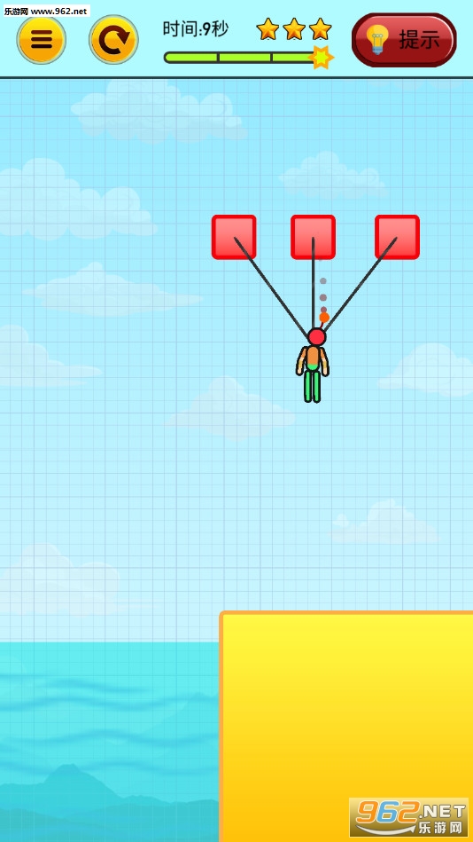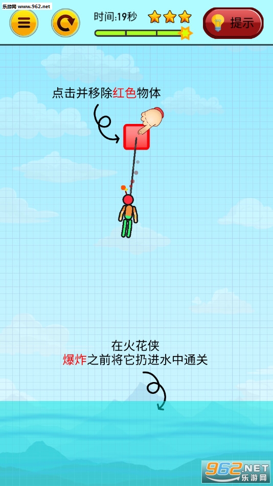 《火柴人着火了游戏》(Man on Fire)是一款画面清新简约的将火柴人丢入水中的趣味闯关手游,游戏中火柴人被绳子绑在支点上面,脑袋上冒着火,玩家只能点击红色的方块来消除让火柴人掉入水中,让火柴人头顶的火熄灭。