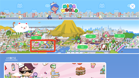 2、点开商城可以看到整个米加小镇的地图,建筑上方有绿色的√说明已经解锁了,找到你想解锁的地方,点击上面的GO字样。