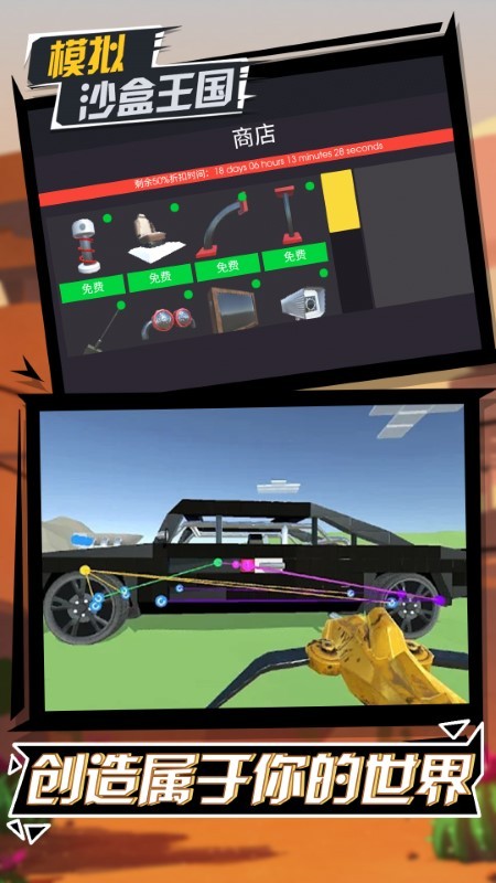 您可以从基本块构建复杂的机制。您的库存中有很多物品,例如发动机,推进器,车轮,油漆工具,连接工具,不同的块。带他们去创造一些动人的东西。您可以建造车辆,电梯,火车,机器人。您可以保存您的工作并与他人共享。
