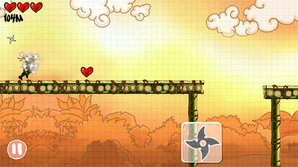 操作极其简单:单点跳跃、双击二段跳、点击飞镖按钮即可远程攻击,滑动屏幕还能瞬间加速!沿途别忘了收集红心(恢复体力)和风车(临时加速),每局结束后还能查看战绩、解锁成就。轻松上手,越玩越上头,快来下载体验这场指尖上的忍者疾行吧!