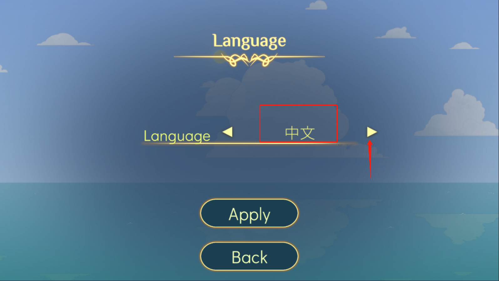 3. 点击右侧箭头循环切换,直至显示【中文】,最后点击【Apply】保存设置即可!