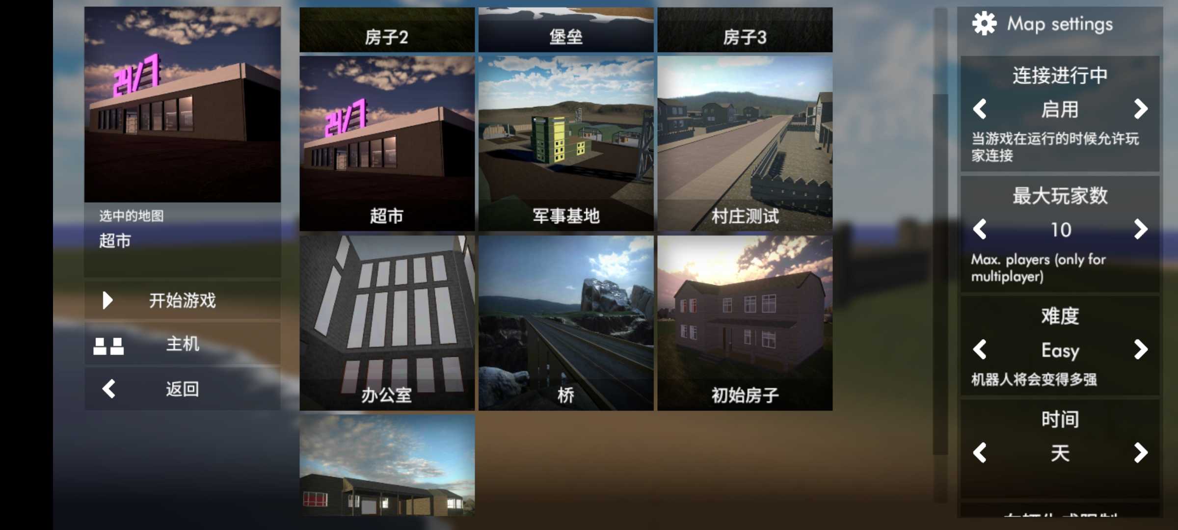 4. 汉化版独享内置地图包!包含堡垒、军事基地、超市等多种场景。例如选择超市”地图,并将难度设为【Easy】,轻松开启新手局。