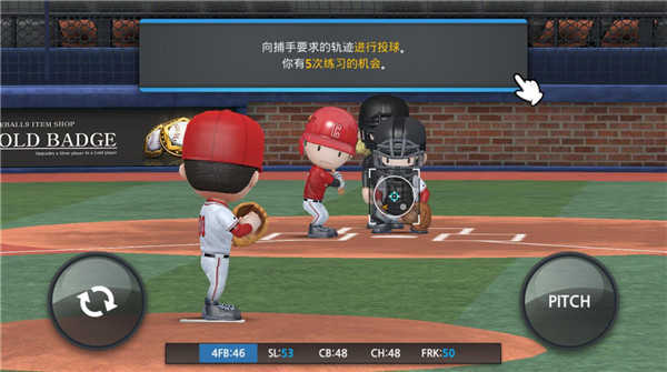 2. 投球时,点击右侧Pitch”按钮,拖动控球指针调整投球落点。