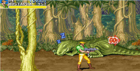 第二关:北部森林 树下藏有加分宝箱;可利用睡醒的恐龙清理小兵;独创白痴BOSS打法”:将其双刀置于屏幕中线后站边缘,BOSS将丧失机动性,任你反复踢出屏幕。