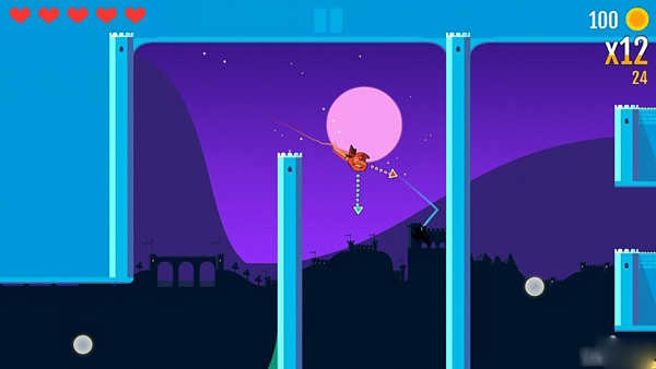 本作还支持双指独立操控:可同时调节移动方向与攻击角度,甚至在按住一侧屏幕的同时操作另一侧。如图所示,使用两根手指分别控制不同区域(屏幕上两个白点示意),当松开左侧而保持右侧按压时,角色将进入慢动作飞行状态,并沿先前设定的方向持续前行。只要右手不松开,便可反复执行此类微调。