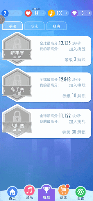 3、点击【挑战】模块,可参与限时赛事、无尽模式等多种玩法。游戏设计了多元化的挑战形式,增强互动性与可玩性,让玩家在轻松氛围中享受节奏打击的乐趣,缓解日常压力。