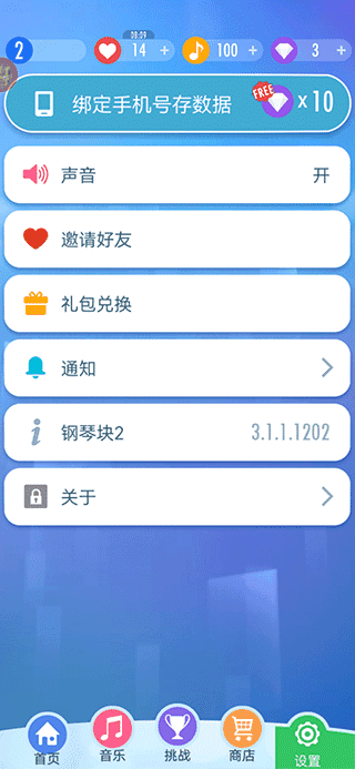 5、在【设置】菜单中,玩家可调节背景音乐与音效开关,管理通知权限,并使用兑换码领取福利礼包。建议新手绑定手机号以实现数据备份,防止丢失进度;同时关注官方公众号还可定期领取免费钻石,助力更快成长。