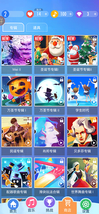4、若想解锁更多曲目或获取特殊道具,可进入【商店】进行购买。大部分歌曲可通过游戏中赚取的钻石兑换,而部分稀有道具则需要充值获取。不过,完成每日任务、达成成就或升级奖励也能免费获得部分道具资源,合理规划同样能畅享全部内容。