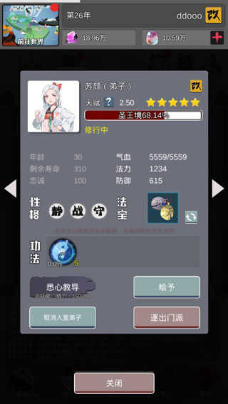 6、入室弟子享有修炼加速加成,但当前入室者一旦达到当前世界最高境界便不再获得经验,应及时更换为更有需求的弟子,确保资源高效流转。