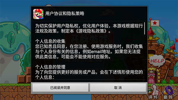 1、启动超级玛丽单机手机版后,点击主界面上的应用图标进入游戏,浏览介绍信息并点击同意”即可开始游玩。