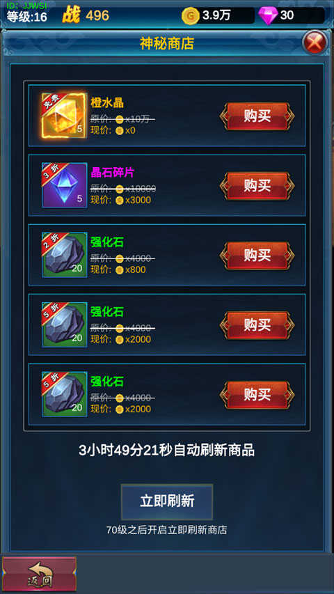 5、商店提供多种高级资源,包括强化水晶、装备碎片等,助力快速成长;