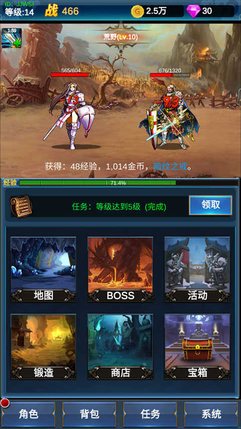 1、进入游戏后,角色与敌人会自动进入战斗状态,全程无需手动操作,玩家只需定时领取战斗产出的装备和资源即可;