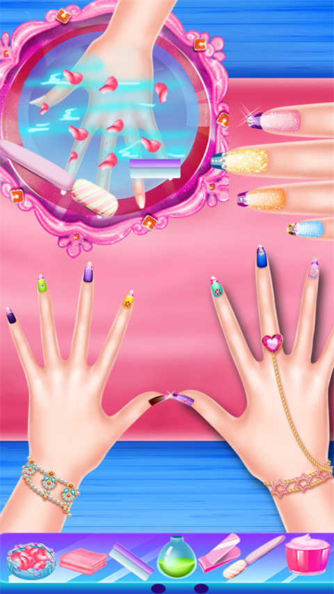 3、自由设计指甲艺术,每一片指甲都能涂上不同色彩,并添加闪钻、贴纸等个性化装饰。