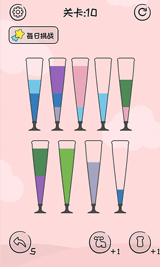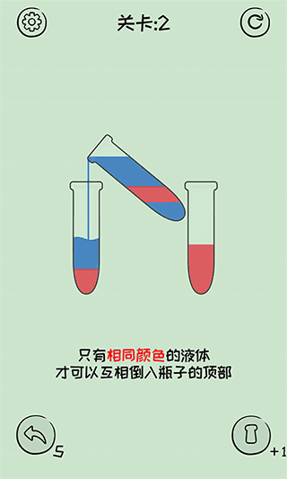 1、点击选中装有彩沙的瓶子即可倾倒,仅当目标瓶内顶部颜色一致且留有空间时,倒沙操作才能执行