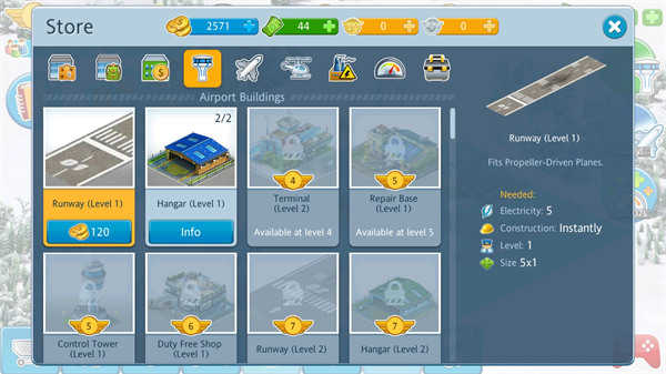 1、城市一开始会有明显的机场与市政区区分,位于右方的航站区是机场的重心,这里可以放置跑道、停机坪、管制塔等航空设施,只要有飞机和跑道便能开始营运,一间停机坪只能停放一架飞机,初期购买的螺旋桨飞机只要最小的跑道就能启动,随着游戏进展能够买的机型增大,起降跑道的占地便会越多。