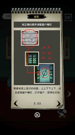 4、按正确的顺序调整窗户栅栏,根据电视上显示的纹路,上上下下上下,点击变换窗户栅栏,打开窗户,获得右天线。