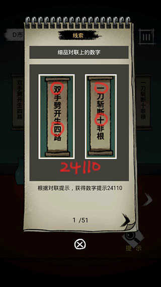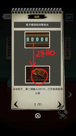 2、柜子密码与对联数字有关,点击柜子,第二格输入24110,打开获得获得火柴。