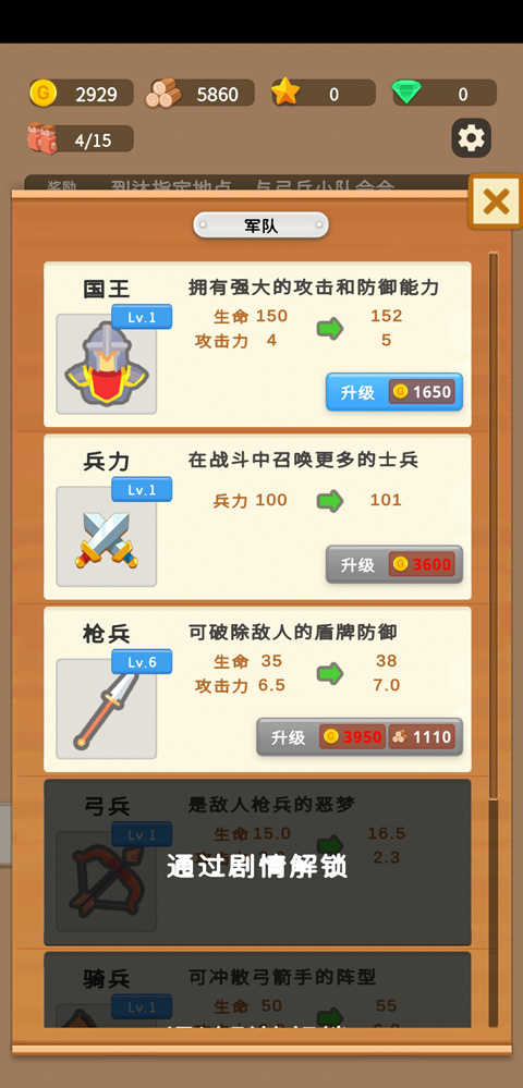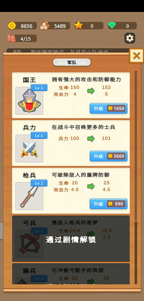 3、选择已解锁的兵种,点击升级”按钮,即可增强其生命值与攻击力,适应更高难度战斗