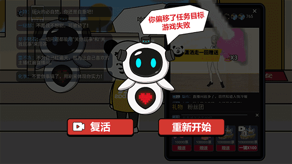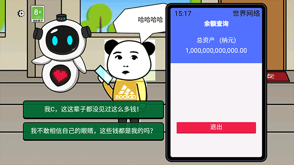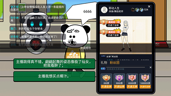 游戏设定在一个物价疯狂缩水十亿倍的奇异世界,所有人都变得一贫如洗,唯独你手握未贬值的巨额财富——开局直接到账10亿元!你将通过一系列剧情对话做出抉择,开启钞能力”人生,比如完成给主播刷到60级”的任务,就能在虚拟手机界面中挑选心仪主播,疯狂送礼、点亮粉丝牌,享受土豪式操作的爽感,过程既荒诞又真实,充满讽刺与幽默。