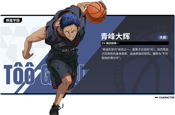 "奇迹的世代"成员之一,是黑子过去的"光"。他凭借自己压倒性的身体素质、自由奔放的球风,被称为"不可阻挡的得分手"。