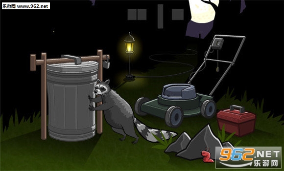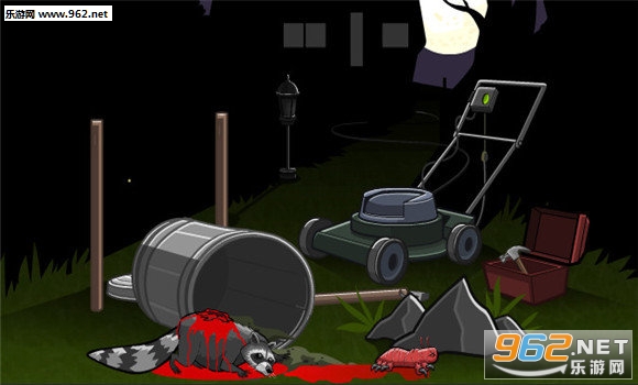 场景1:打开木箱,取出铁锤,敲掉垃圾桶左端的木桩,点击垃圾桶,让臭鼬撞到垃圾桶,拔掉电灯底座的插头,将插头连接在除草机上,此时点击绿色按钮,除草剂发出噪音吓走臭鼬,点击垃圾让异形虫进入垃圾,关掉除草机,臭鼬返回吃垃圾,死亡;