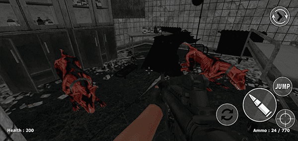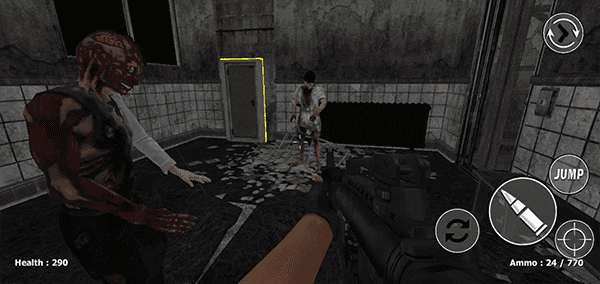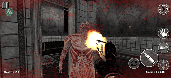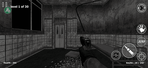 3、在游戏中玩家将利用手中的武器去击杀僵尸,左边屏幕控制移动,右边为换弹、射击、跳跃、瞄准按键