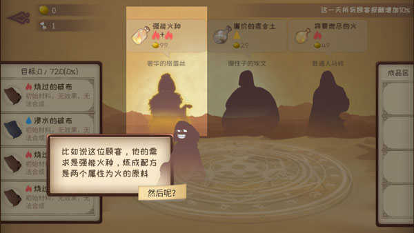 例如,下图中的这位顾客,他的的需求是强能火种,练成配方是两个属性为获得原料,此时你就可以点击上图中的炼金原料区,找到对应属性的材料,并把他们放在法阵上,当然了这里不要求顺序。