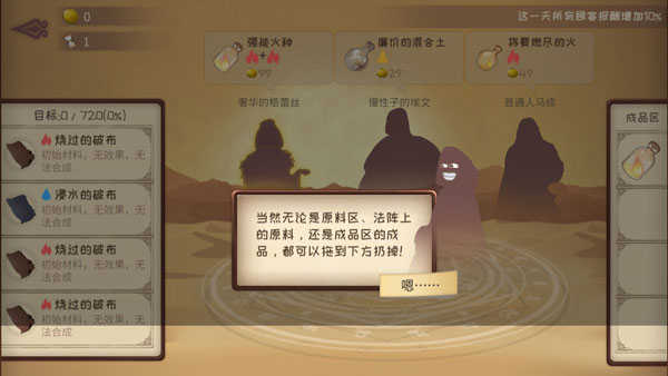 炼化成功后,便可将成品区中的成品交托给顾客,这样你的订单就完成了。再则无论是炼金原料区,还是法阵上的原料以及成品区中的成品都可拖到至游戏屏幕的下侧中进行扔掉。此外顾客也有等待的时间,而且每个顾客都有自己独特的特性,想要查看是何属性时,可以长按顾客来进行查看。