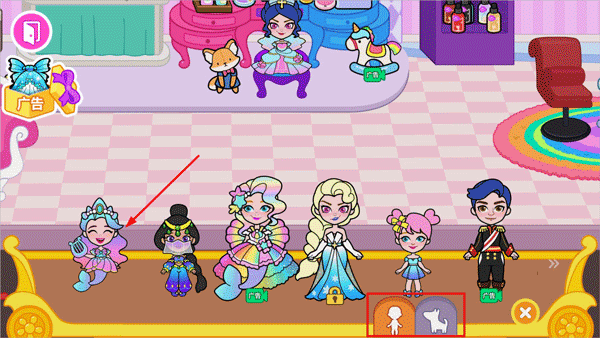 2、左右滑动屏幕可切换不同房间场景,拖动角色调整站位,点击衣柜即可为公主更换服饰,左上角箭头用于场景跳转;