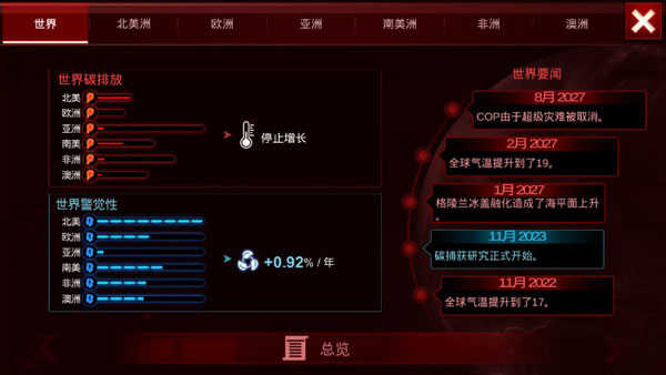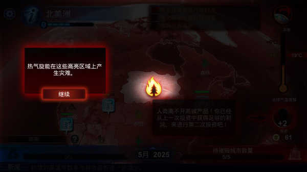 3、此时按照游戏中的目标,只需根据投资的产品进而升高全球的温度就能开始着手下一步的操作了,例如成功的将地球平均气温升高2度,继而引发大气中不稳定的因素。随着环境温室效应的升高,环境的不稳定,玩家将获得使用超级灾难的能力,灾难不仅能摧毁目标区域,也有机会传播到更多的区域产生连锁效应。