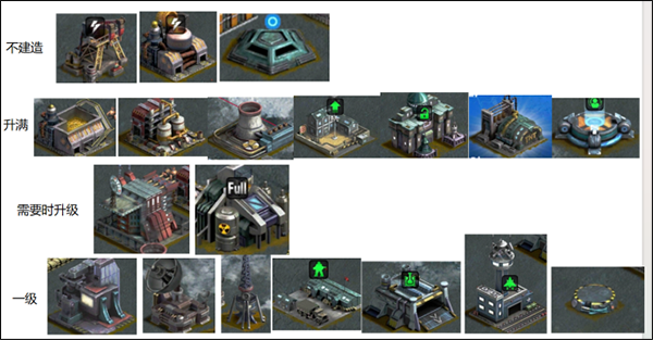 -资源型建筑:金属库与石油库建议优先升级,保障基础资源供应;铀库与发电站按需提升即可。初期配置两座金属库、一座石油库与一座发电站已足够支撑发展。冶炼厂与油井无需升级,也不推荐额外建造。