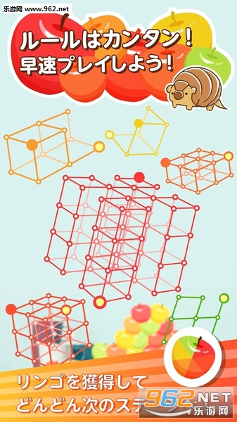 在大小不一的6种关卡中,分别设定了6个路线。用管道把起点和终点连接起来,让小动物吃到苹果即算通关点位置的宠物在隧道中滚动。宠物平安到达终点的苹果就可以清除了。