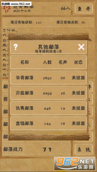 趣味的文明建造游戏,你将成为部落的首领,不断的将部落发展壮大,注意提升名声和声望,训练士兵,提高武力,合理的进行生育等,喜欢的朋友可以下载试试。