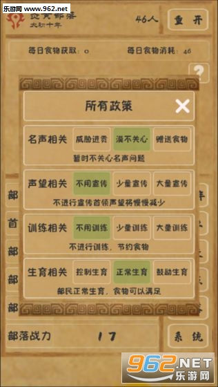 部名体质初始为10,后面有涨,但是再后来一直降一直降,一直到0,每一年都会死七八个,后面只剩十几个部民了,感觉都要灭部了,当机立断增加宣传提高名声,开始有流民投靠了。