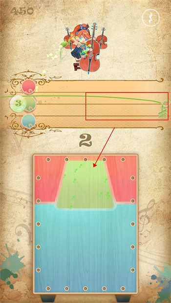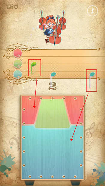 7、游戏玩法以三色演奏为主,上方会出现音符,玩家需要点击下方对应颜色收集音符,也可以根据鼓声节奏来击鼓。
