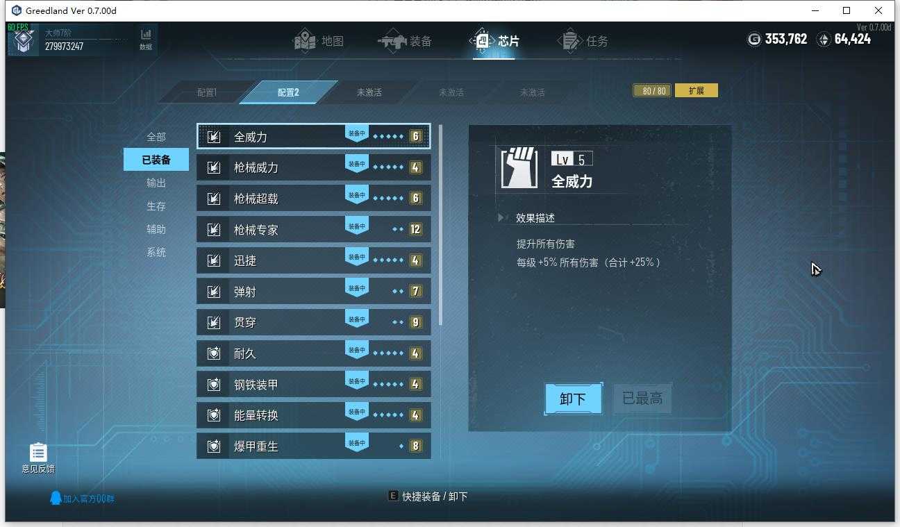 这套芯片的配置就是提高辅助武器的输出,能提高辅助武器伤害以及速度的芯片全选,包括玻璃大炮、近战(增加近距离怪物收到的伤害)、精准打击有待验证,我是选了。增加主武器伤害的芯片不选,因为主武器就1个,辅助有8个,主要输出还是靠辅助武器。