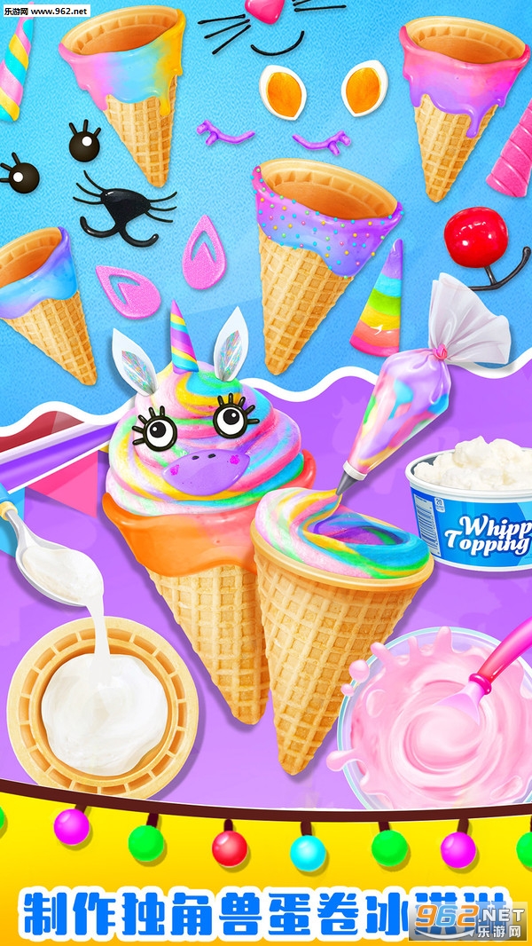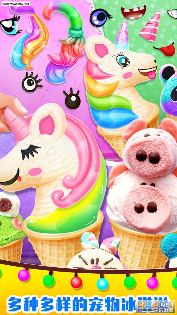 非常轻松简单的一款冰激凌制作类游戏,玩家极易上手,在这里你可以发挥你天马行空的想象力,制作各种自己感兴趣的冰激凌,口味,外观等都可以由你掌控,更有各种各样美丽的独角兽在装饰你的冰激凌。