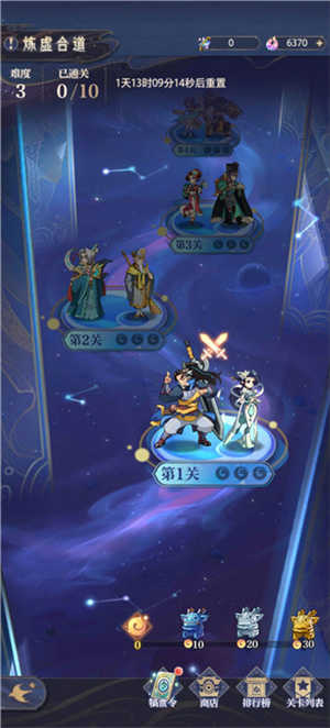 在「炼虚合道」玩法中,有多个难度章节供仙友们选择挑战,每个章节分为10个关卡,每通过1个关卡可获得通关奖励,通关10个关卡可获得章节通关宝箱。