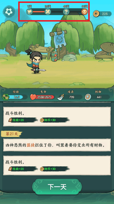 5、不断的点下一天,之后上面的进度条到最后,你的江湖经历就完成了。