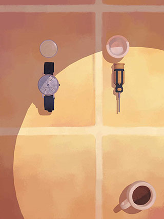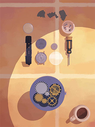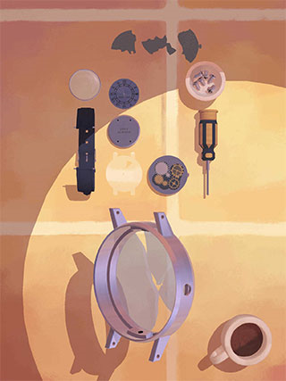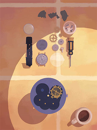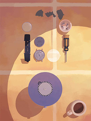 2、然后把所有的物件全都拆封出来,相信大家都会的,卸掉表带,用螺丝刀把螺丝拧下来,把所有的部件都分开放在桌上。这时就会有一个动画,安装齿轮的地方碎了一地,然后他就会给你一个新的部件。记得要把所有的齿轮捡出来放好。