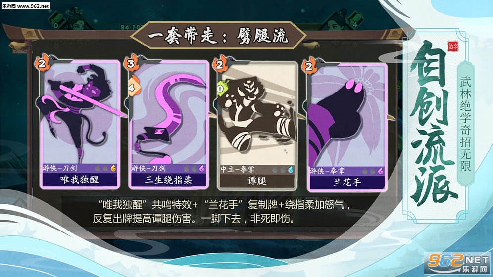 一款武侠风Roguelite DBG(卡组构筑游戏),游戏以过图闯关为主要玩法,玩家在关卡中不断的获取新的卡牌替换旧的卡牌,组建出理想的卡组流派,对抗强大的带头大哥。五大职业数十种武侠,数百种武学,更有套装、神兵、经脉等元素,让你构建出意想不到的卡组!
