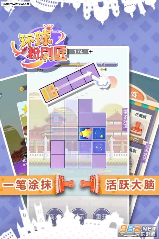 操作简单,画面可爱的卡通风格的世界背景,玩家作为一个勤劳的粉刷匠,在环球之行中粉刷着每个城市;