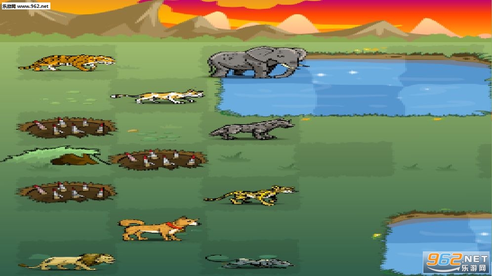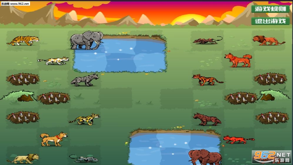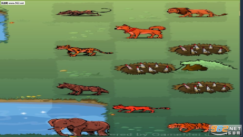 中间有两条小河(跟湖差不多),狮、虎可以横直方向跳过河,直接把对岸的动物吃掉。