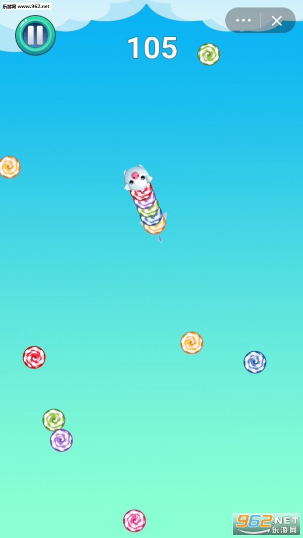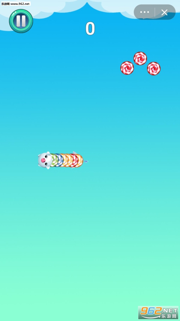 1、控制小猪在天空移动,收集各种彩色的糖果,让同种颜色的消除;