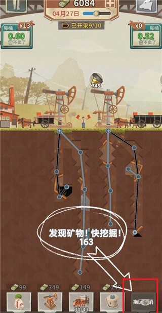 1、发现矿脉后,使用右下角的探测工具进行定位,并启动挖掘功能。
