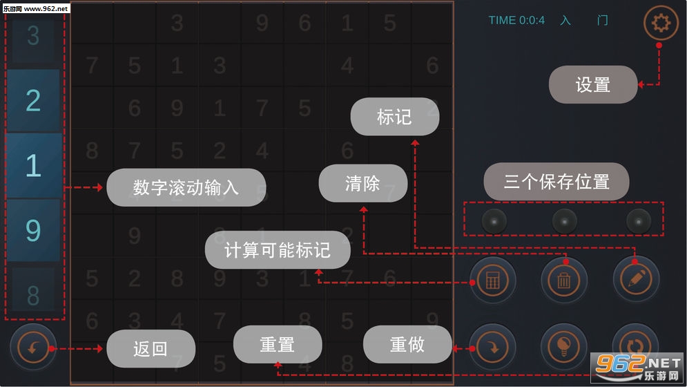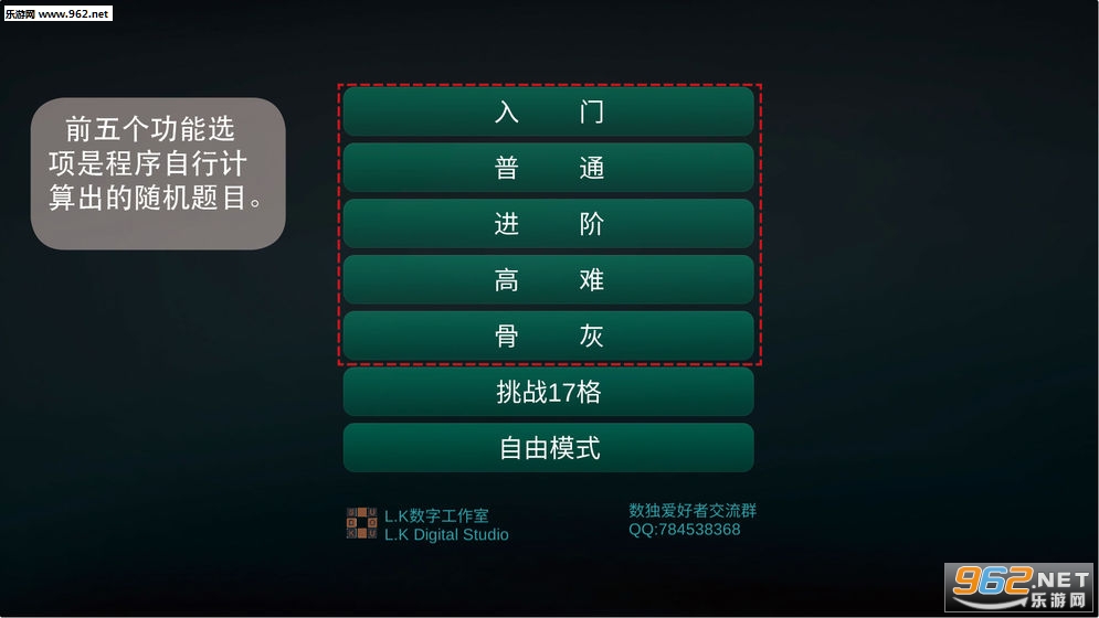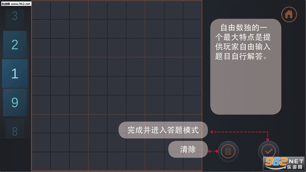 本游戏的特色是程序无限随机计算数独题目,同时,当你在别处发现了好玩的数独题目也可以在“自由模式”下输入并进行解答。