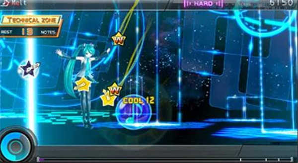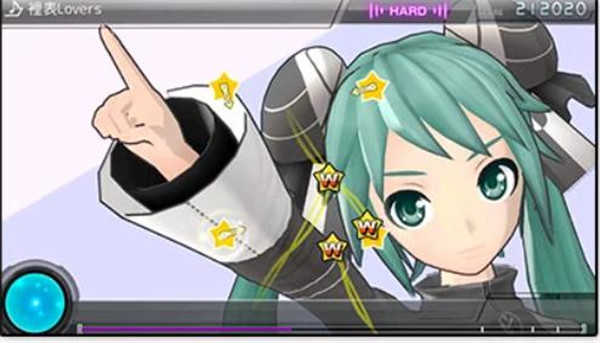 节奏模式是《初音未来》系列的特色模式。在该模式中,当按键目标出现在画面内,抓准与图示重叠的瞬间按下按钮,如果能维持一定区段的连段,过关时的评价也会额外加分。直到将其通关。